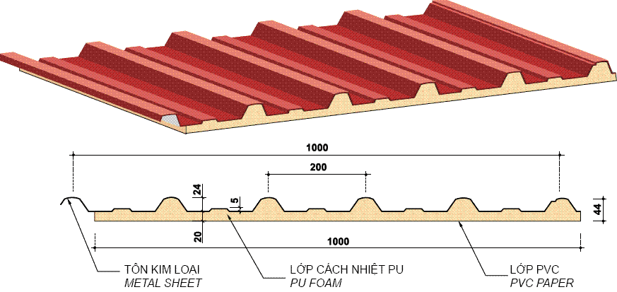 - Lớp đầu tiên: Đây là lớp tôn bên ngoài, nó có tác dụng chịu mọi tác động của thời tiết và con người lên trần nhà. Với độ dày 0.22 mm (+-2), với nhiều sự lựa chọn cho bề mặt: Bề mặt bằng phẳng, Bề mặt 2 gân nhỏ.